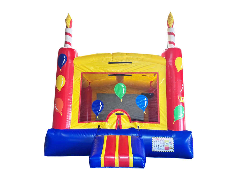 Make birthdays special with a birthday themed inflatable bounce house. This bounce house resembles a birthday cake complete with candles and colorful balloons in pink, yellow and orange. An inflatable ramp and door provide easy access and large mesh windows provide airflow to keep children cool. Kids will love bouncing for hours in this fun and festive inflatable.