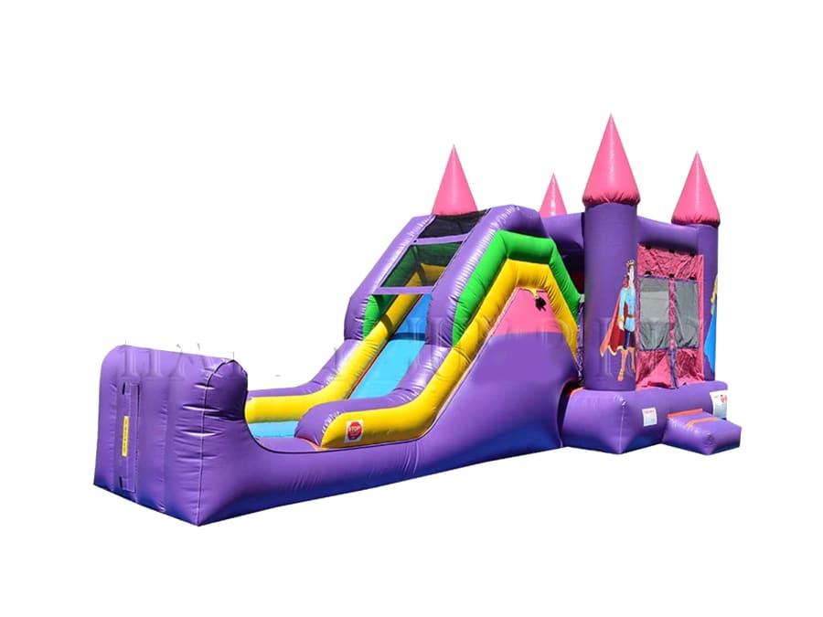 Super Combo Princess theme is one of our best sellers, and a must have to your rental fleet. This inflatable game is always a hit at any event! It may be used dry & it includes a spacious jump area, a basketball hoop (inside), a challenging wall climb & a tall slide. With all these choices, kids of all ages will be engaged for hours. Featuring a beautiful princess castle theme with prince and princess artwork and vibrant pink and purple colors.