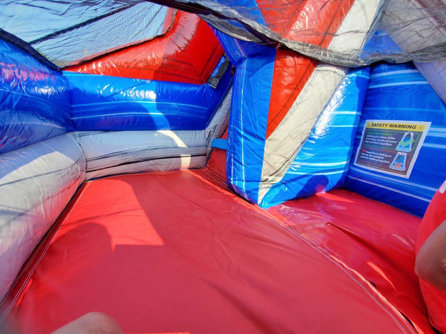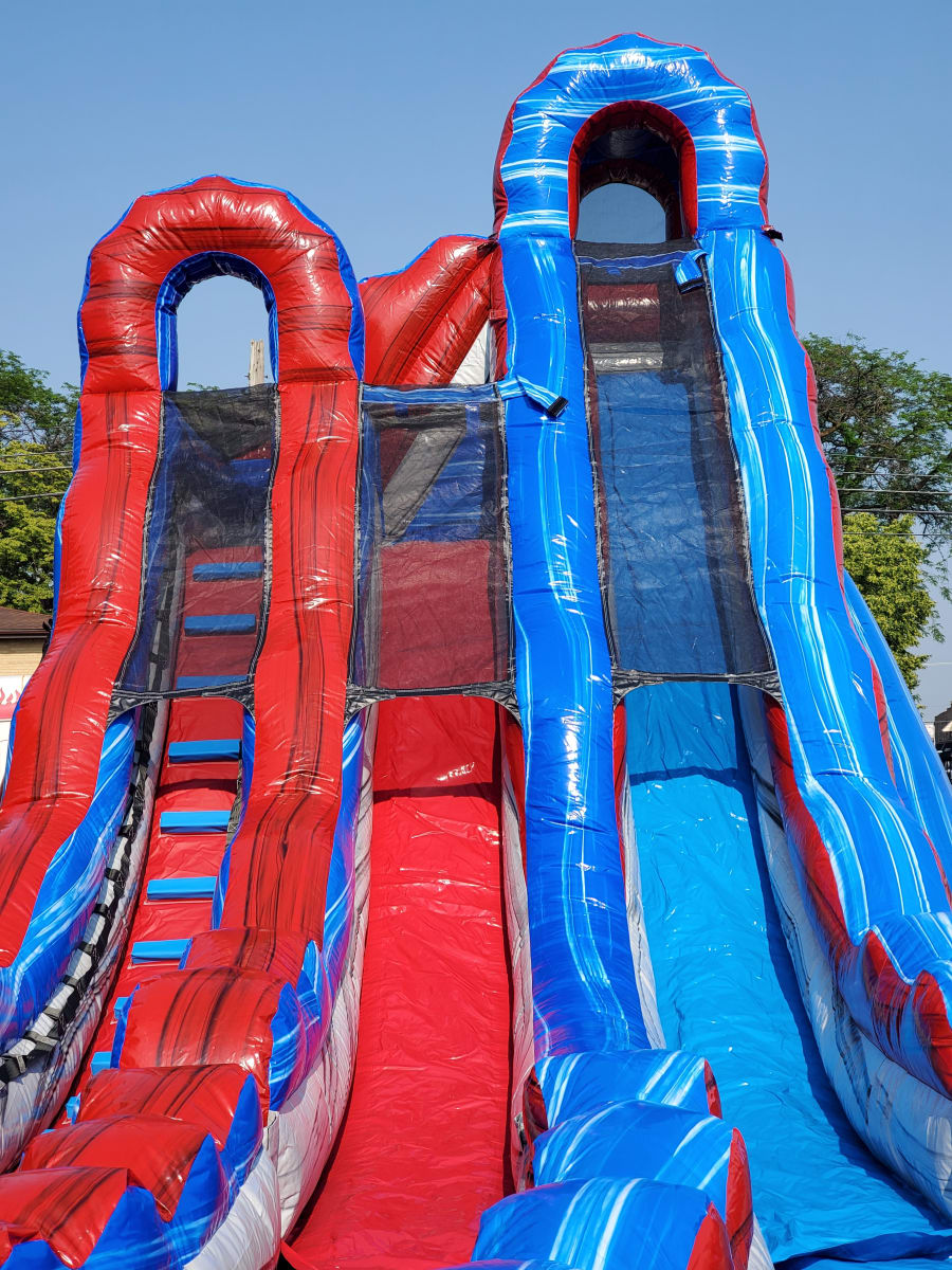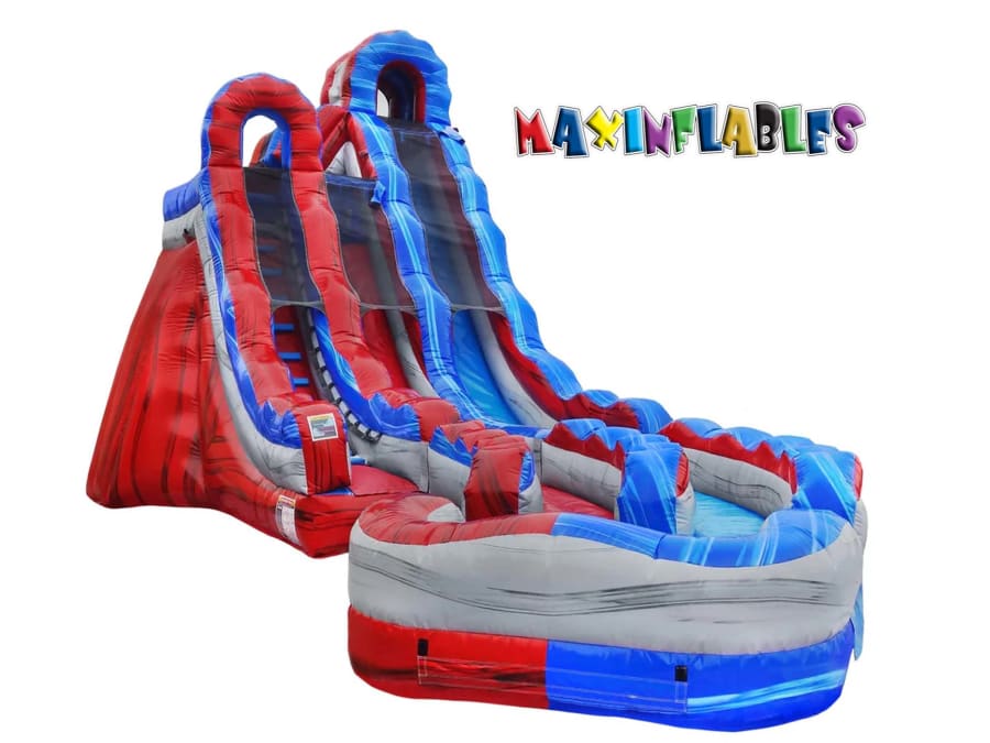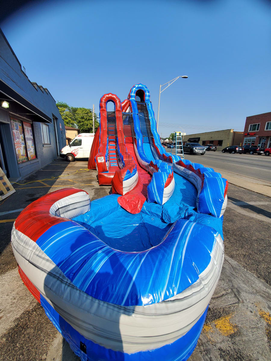 Let us help you beat the heat at your next event with our 18' Double Curve Water Slide with pool . This 18' water slide will have your guest sliding down the slide and landing in a nice cool pool of water. Cool off from the summer heat with the 18 ' Double Lane Inflatable Water Slide. If one sliding lane is great, then two is twice the fun and half the wait for your next turn! This inflatable water slide provides superior fun and excitement to kids of all ages. With its gender-neutral colors, this versatile unit can be utilized at an all-boys or all-girls events. Use this slide without water on a cool day to create some big smiles or simply connect the built-in misting system to a standard garden hose on a hot day and coast down for some wet refreshment!