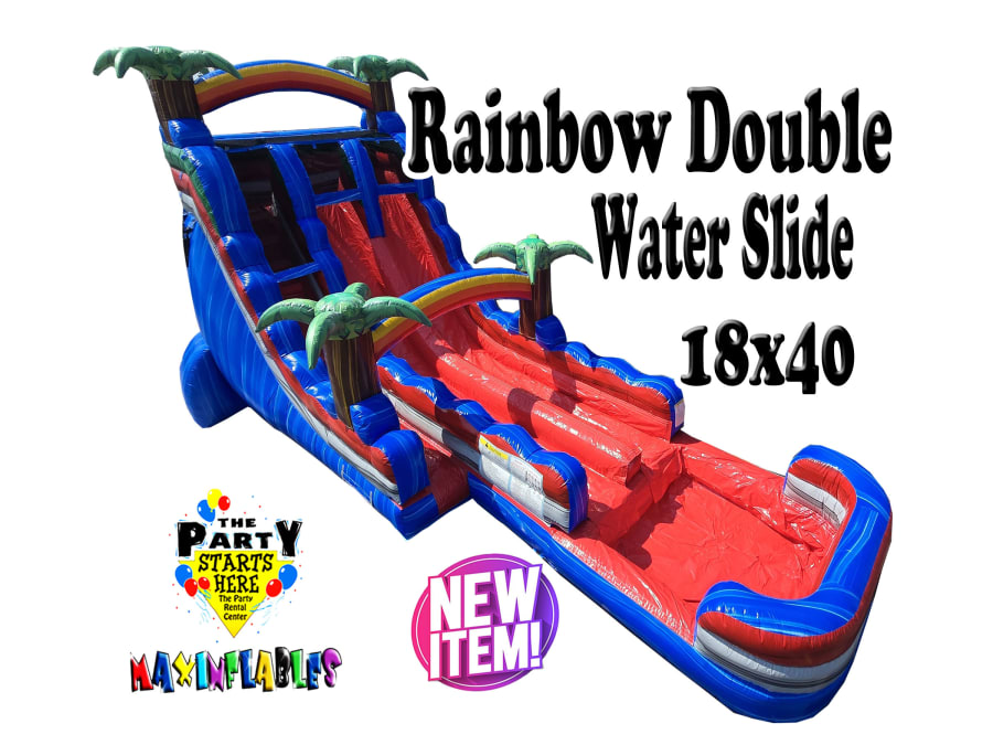 🌴🌈 Make your next event unforgettable with the Tropical Rainbow Double Waterslide—the most exciting and visually stunning double waterslide in Melrose Park and surrounding areas! Standing a thrilling 18 feet tall and stretching a massive 40 feet in length, this inflatable waterslide is designed for pure enjoyment and safe fun for guests of all ages. Whether you’re planning a birthday party, family reunion, or community event, this vibrant attraction guarantees hours of laughter and excitement.